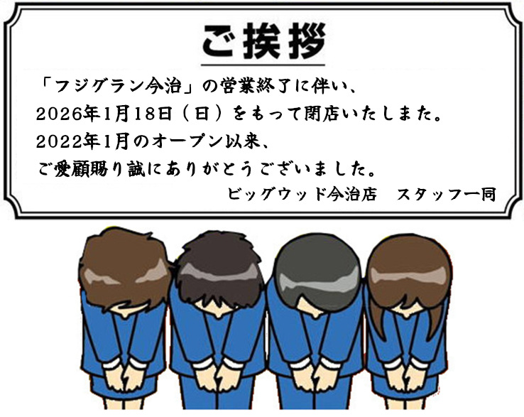 「フジグラン今治」の営業終了に伴い、2026年1月18日(日)をもって閉店いたしました。 2022年1月オープン以来、ご愛顧賜り誠にありがとうございました。